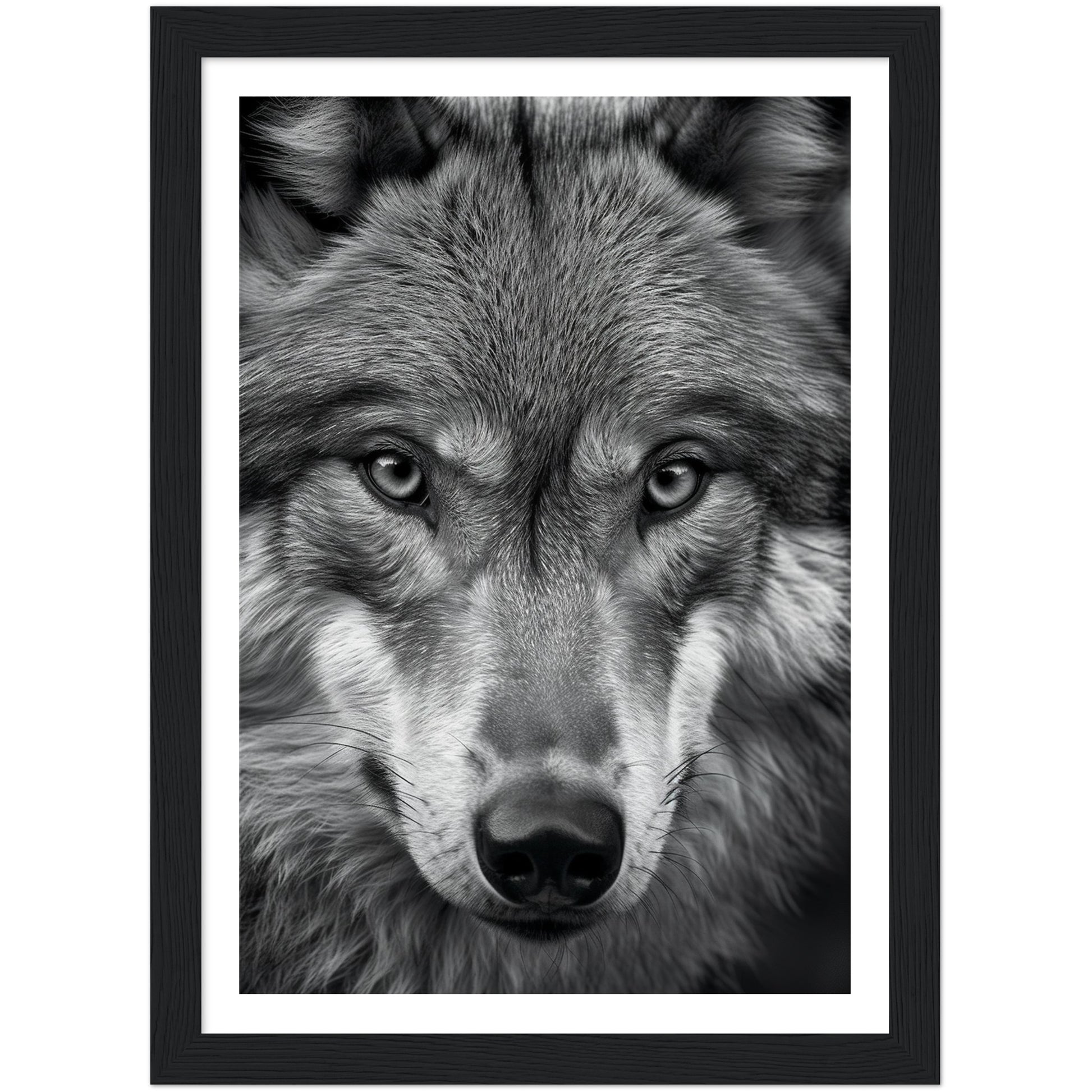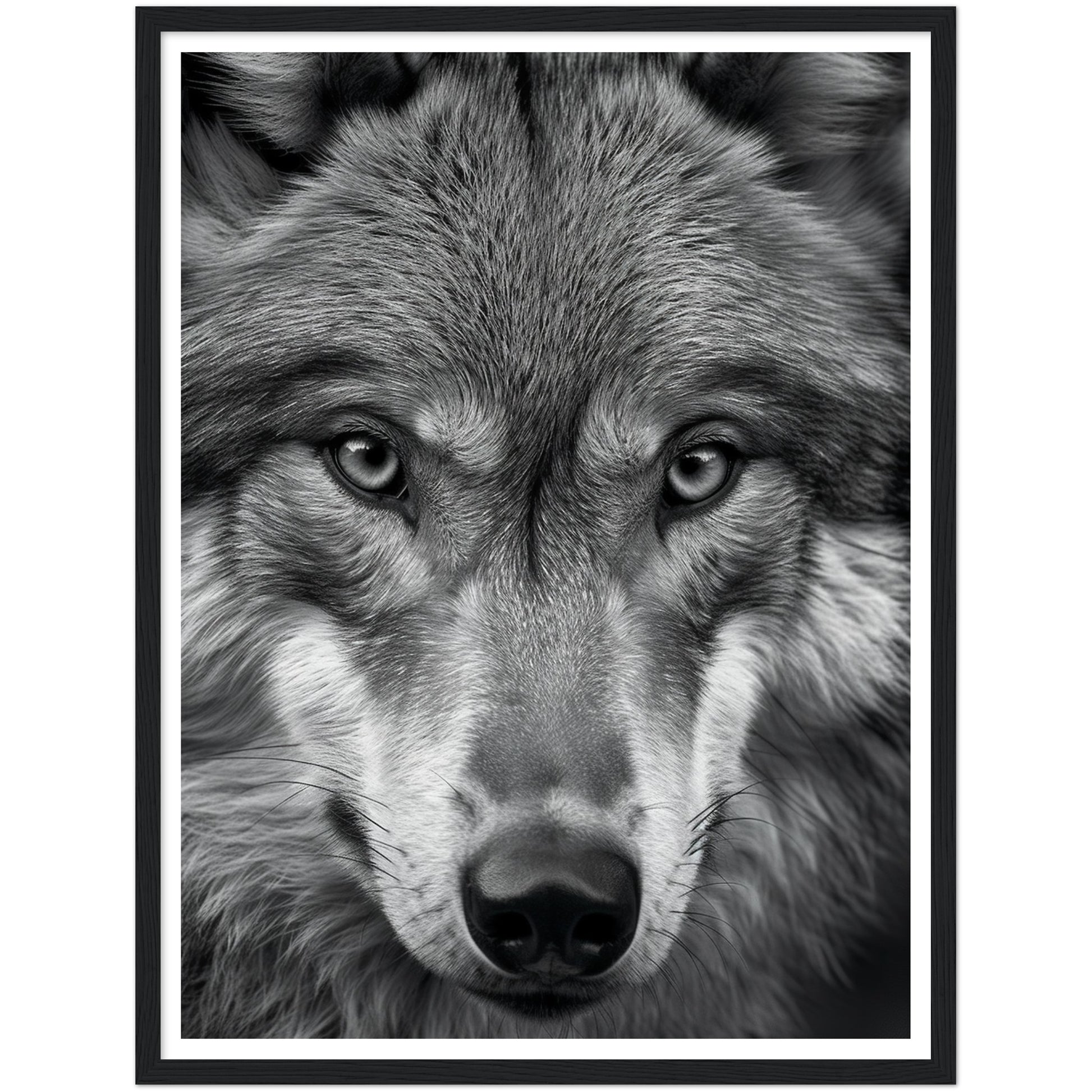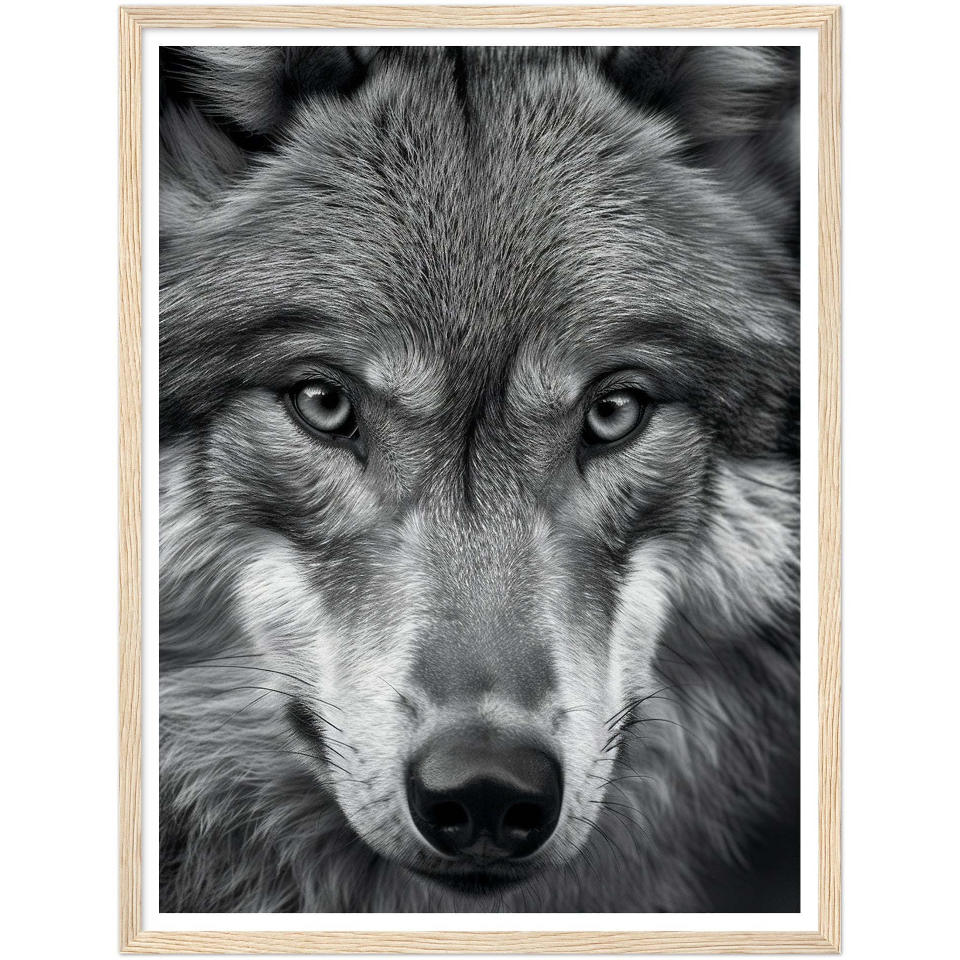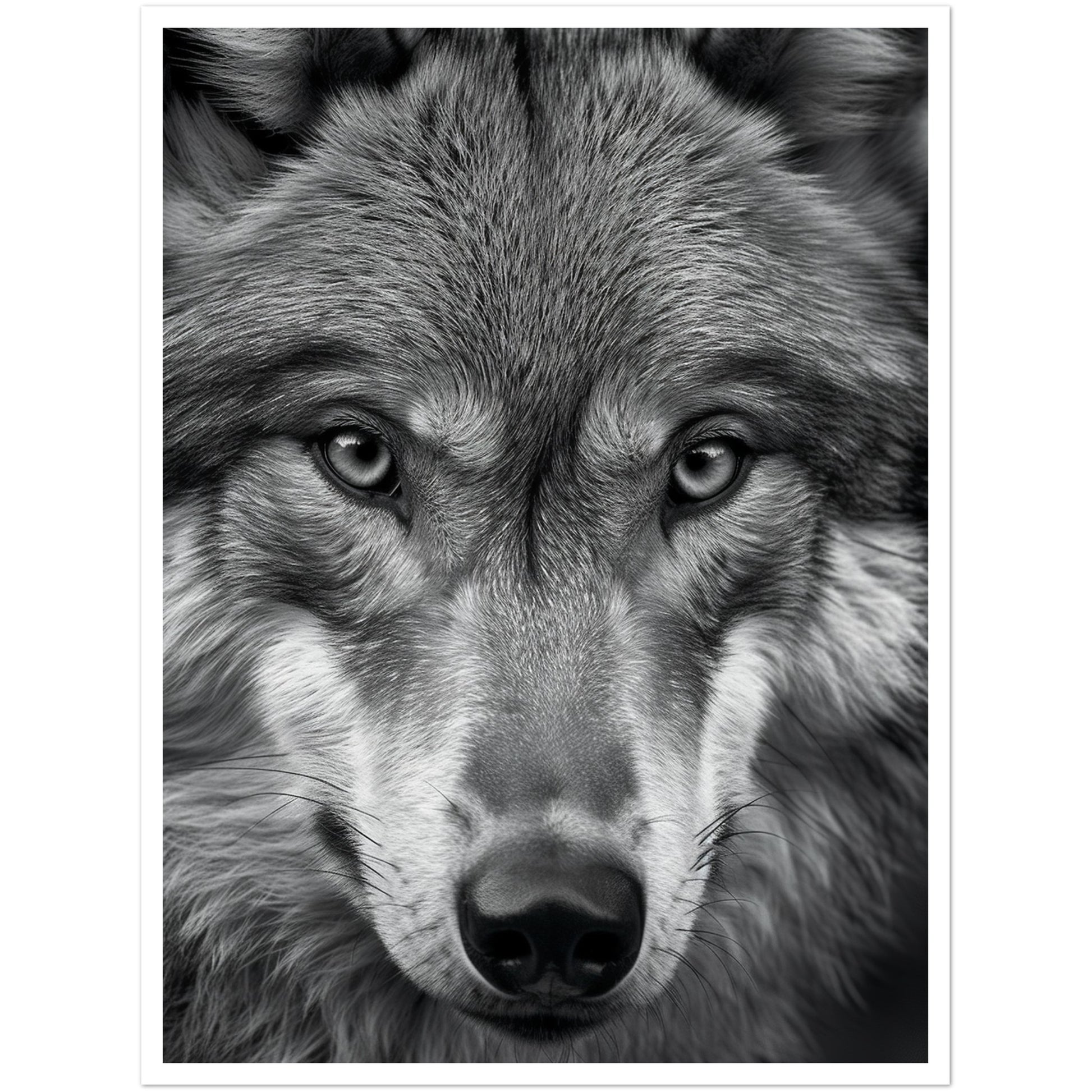 This stunning black and white photograph captures the intense gaze of a wolf in a close-up, cropped composition. The intricate details of the wolf's fur and piercing eyes are highlighted in this striking piece of art. The monochromatic color scheme adds a timeless and classic feel to the image, making it a perfect addition to any home or office decor. The high-quality print is produced on premium paper, ensuring that the image is sharp and vibrant. This piece is perfect for animal lovers, nature enthusiasts, or anyone who appreciates the beauty of wildlife. Hang it on your wall and let the wolf's fierce and majestic presence inspire you every day.
